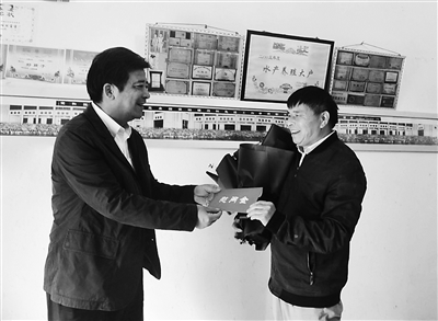 图为潘志强(左)向夏汝清送上了鲜花和慰问金。