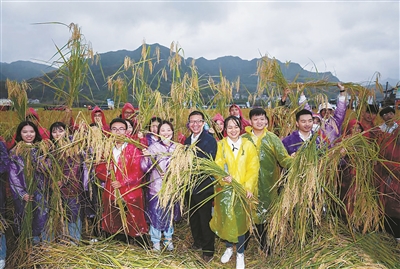日前,游客在建德市三都镇新和村袁隆平生态水稻种植基地与收割的“巨型稻”合影。