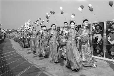 近日,兰溪市区中洲公园草坪上,100对青年身着传统服装举行集体婚礼,喜结良缘。据了解,这100对青年来自各行各业,有企业职工、科技人才、医生护士、人民教师等。