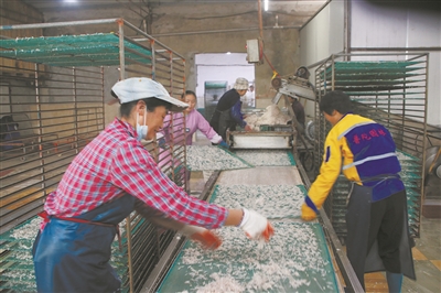 11月3日,在舟山市普陀区蚂蚁岛上的一家虾皮加工企业里,工人们在机器前忙碌地赶制虾皮。自饭虾开捕以来,由于没有长时间的冷空气和大风天气影响,饭虾产量明显上涨,也带动了当地虾皮加工企业的生产。