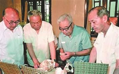 | 古人类学家吴汝康(右一)、考古学家贾兰坡(右二)、苏秉琦(右三)、安志敏(右四)正在对金牛山人类化石进行鉴定。喻惠如 摄 |