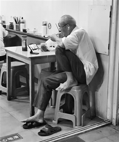 智能手机的功能广泛,影响并改变着人类的生活。这两张照片是记者用手机抓拍来的。左边这张是记者在杭州武林广场电信大楼办事时,看到一位老人用右手拿着放大镜,去看左手的手机,全神贯注地了解手机里的信息;右边这张则是日前拍于萧山区育才路的一家小饭馆,一位喝过酒的老人,正通过有线耳机连接着智能手机,悠闲地边抽烟边追剧,沉浸在精彩的剧情中,好不惬意。