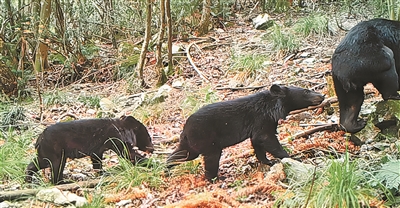 本报讯 记者金钧胤报道 日前,浙江九龙山国家级自然保护区科研站工作人员整理红外相机数据时发现一段珍贵影像。影像显示,今年4月,一只成年黑熊“拖家带口”在保护区内放置的红外相机前悠闲走过。