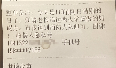 “没人点过奶茶,这是什么情况?”正当疑惑时,外卖小哥将订单纸条交给岗哨,纸条上的订餐人对手机号码做了隐私处理,只备注:“今天是119消防日,特别的日子。烦请老板给这些‘火焰蓝’做得好喝点。”备注上字字都暖心,在这个特殊的节日里让收到礼物的消防员们感受到了别样的温暖。