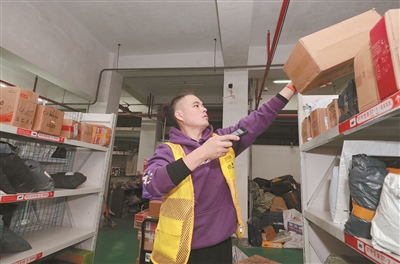 | 陆军将每一件快递入库上货架。 记者邹伟锋 摄 |