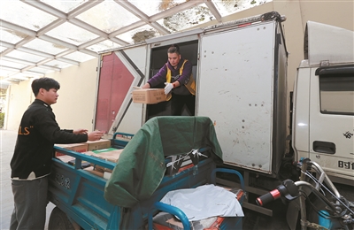 | 由于陆军的小货车不能直达经营点,陆军和同事只好进行第二次转运。 记者邹伟锋 摄 |