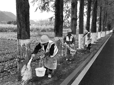 图为公路养护人员正在给行道树进行全面刷白和养护。徐曙光