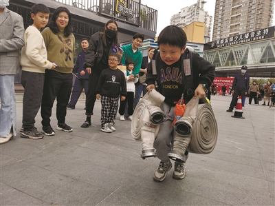 11月20日下午,温岭消防大队联合太平街道应急办在新天地广场举行“消防亲子嘉年华”,活动设穿消防服、背空呼器,提水带20米折返跑、甩水带、知识抢答等环节,吸引100余对亲子参加。一名9岁男孩背起12公斤重的空呼器,双手各提一卷5公斤重的水带咬牙跑完全程,看得参加活动的家长连竖大拇指。通讯员张鲜红 摄