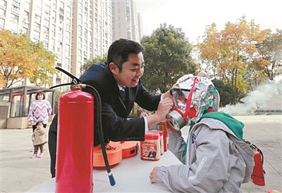 火灾救援演练、器材使用讲解、防火知识普及……近日,杭州市余杭区西溪山庄小区物业联合余杭荆余路消防站、街道、社区举行了一场别开生面的消防安全教育进小区活动,广大业主踊跃参与消防知识学习,增强防火意识,提升自防自救能力。图为业主小朋友体验过滤式消防自救呼吸器正确佩戴方法。