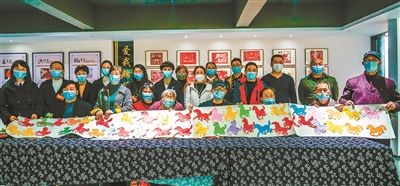 图为师生展示集体创作的10米剪纸作品《奔马图》。