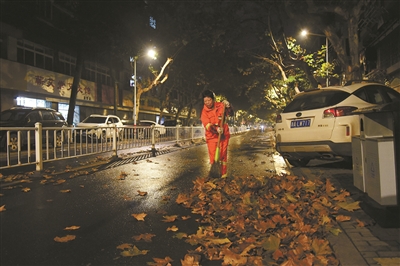 11月30日清晨4时30分,几场风雨过后,落叶飘满一地。建德市新安江环卫所保洁员叶美英一早就在环城北路保洁责任区路段,冒着风雨天气,不停地清扫路面上的梧桐树叶,来回一遍又一遍,确保道路的清洁卫生,市容整洁。通讯员宁文武 摄