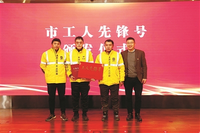 | 叶阳辉(左二)爱心团队被授予杭州市工人先锋号。 |