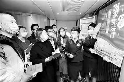 近日,在温州南开往阜阳西的G7796次列车上,杭州客运段高铁四车队驿家亲乘务组向旅客普及宪法知识,让依宪治国和依法治国的理念更加深入人心,受到旅客们的关注和欢迎。