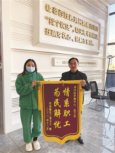 本报讯 记者程雪 通讯员杭航报道 近日,智女士专程来到湖州市吴兴区社会矛盾纠纷调处化解中心,向维权帮扶中心窗口工作人员杨伟良送上一面写着“情系职工、为民解忧”的锦旗,她说,“感谢工会,让我顺利拿回工伤赔偿金。”
