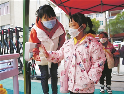 昨日一大早,在玉环市龙溪镇中心幼儿园门口,小朋友们在老师指导下例行戴口罩、一米线、测体温、查口腔、洗手消毒等防控疫情措施,学习重温每日防疫健康第一课,平安健康入园。