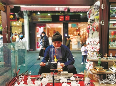 | 工匠一边展示玻璃工艺一边直播。 记者曾晨路 摄 |