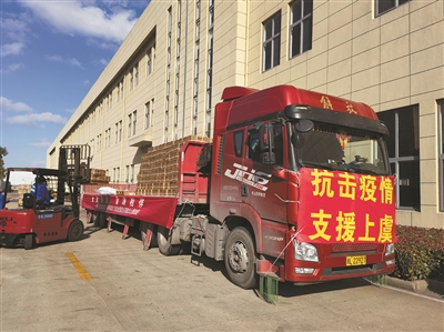 近日,位于岱山县的浙江绿海制盐有限责任公司内,一箱箱产自岱山的雪涛亚运自然鲜晒系列食盐装上了大货车,货车头部挂着“抗击疫情,支援上虞”的红色横幅,一车食盐随后被运往绍兴上虞。
