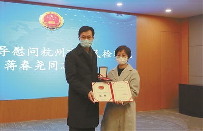 本报讯 记者曾晨路报道 10月19日晚,杭州市检察院检察委员会委员、第七检察部主任、三级高级检察官蒋春尧同志因连续工作操劳过度,突发电解质紊乱、急性昏迷,经抢救无效不幸殉职,将年仅56岁的生命定格在了为民服务一线。日前,为进一步弘扬社会主义核心价值观,充分发挥先进人物的典型示范作用,省总工会决定授予蒋春尧同志省五一劳动奖章称号。昨日,省委宣传部副部长、省委网信办主任,省总工会党组书记、副主席张才方前往杭州市检察院慰问蒋春尧同志家属,并送上沉甸甸的省五一劳动奖章及证书。杭州市检察院党组副书记、常务副检察长沈建光介绍了蒋春尧同志的先进事迹。