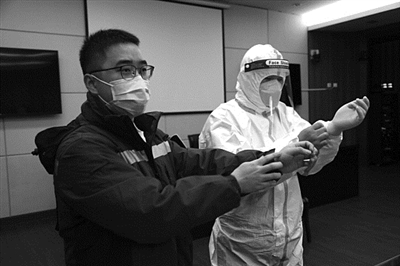 图为疾控专家正在指导该局一线执法人员如何正确穿、脱防护服。
