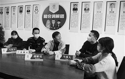 近来,台州市路桥区路桥派出所发挥社会威望高的乡贤在矛盾纠纷调处中的作用,成立起乡贤和合调解团,协助公安民警开展基层矛盾纠纷的调处,维护基层社会治安和谐稳定。图为12月23日,路桥派出所民警和乡贤在调处矛盾纠纷时倾听一方当事人的叙述。