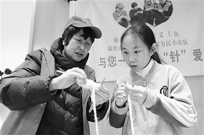 12月21日下午是温岭市松门镇第二小学的社团活动时间,编织社的同学们围着一群身穿红马甲的阿姨们,一针一线学习织围巾。
