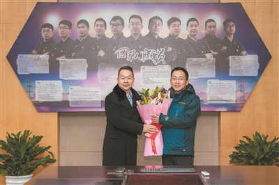 | 胡长虹向全国劳模、浙江工匠曹辉送上鲜花和祝福。通讯员林金坚 摄 |