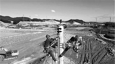 2021年12月23日,磐安尚湖镇10千伏万苍线32号至35号杆迁改作业现场,国网磐安县供电公司员工吴宗强爬上电线杆,入目便是漫天黄土,但他知道,来年春暖花开时,这里将铺满绿色。