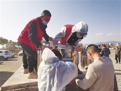 1月3日17时,爱心企业春晓苑大酒店和社区工作人员为滞留的200余位司机和陪乘人员送上了青菜炒饭、水饺、橙子等爱心晚餐。“吃上米饭和水饺,心里感觉踏实多了,也不是特别着急了。感谢所有的工作人员,让我很温暖。”货车司机王师傅说。