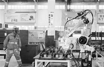 据介绍,传统的人力劳动被机器代替,效率更高,一个全自动焊接机器人比得上5个一流的焊接师傅。图为全自动焊接机器人正在焊接。