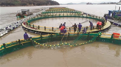 1月6日,舟山市悬山海洋牧场有限公司使用围网在深水网箱里抲大黄鱼,一网网起三四千斤活蹦乱跳的大黄鱼。这里的成品大黄鱼将被陆续销往全国各地,供应春节节日市场。