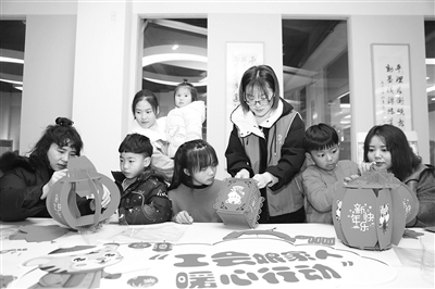 日前,湖州市吴兴区埭溪镇珀莱雅化妆品股份有限公司,工会志愿者邀请企业外来职工及其子女一起做灯笼,营造过年氛围。