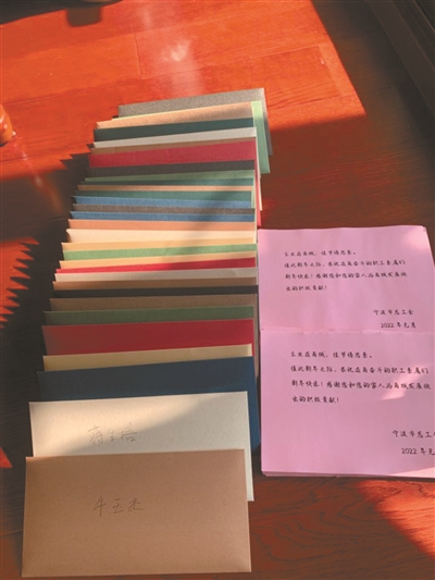 “不让亲情存在于冰冷的屏幕之上,跃然纸上的文字更有温度。”作为宁波市总工会“娘家人陪您留甬过大年”的第一项活动——给远在家乡的父母、伴侣、孩子等直系亲属写上“一封家书”,无疑是特别有温度和爱心的。宁波市总工会还代为寄送职工的信件,职工挂念的那个人还有机会收到工会寄出的宁波特产一份。