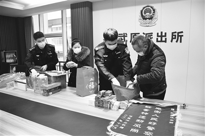 近日,海盐县公安局武原派出所接到报警,武原街道城北西路一家酒业店被盗2瓶贵州茅台酒、2瓶五粮液酒、49条中高档香烟及现金,总价值3万余元。接警后,民警迅速展开侦查,通过视频作战,于当晚11时许,在湖州市吴兴区一网约房内抓获涉案嫌疑人王某、姚某、邵某。同时,根据三人的交代,民警马不停蹄赶往嘉兴市秀洲区抓获购赃嫌疑人罗某,成功追回被盗烟酒及现金。图为民警将烟酒及现金发还给店主。通讯员沈晖 摄