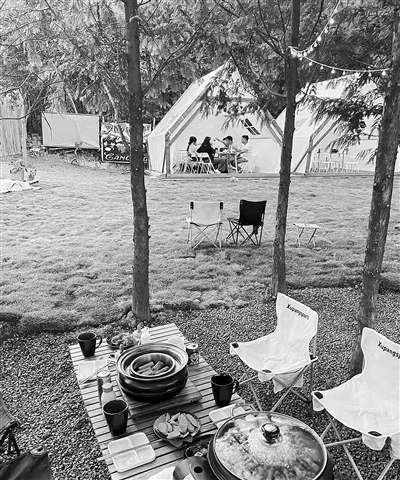 帐篷、味林营地、火锅菜,自烤牛肉,颇有点像部队野营拉练时安营扎寨的味道。有个小家庭正在吃“韩式部队火锅”,他们边吃边往火锅里添加食物,盘子里的食物很丰富,有娃娃菜、豆芽菜、蟹肉棒、烤肠、鱿鱼、羊肉卷、竹伦卷、豆腐、土豆片、西葫芦,外加一小盆雪花肥牛。在冒着气泡的汤汁里倒入秘制的酱汁,那种羊肉、牛肉、蟹肉、蔬菜味和酱香味、辣味,全浓缩在那沸腾的汤汁里。帐篷里芳香四溢,满满的一火锅食物,足以让这个三口之家吃得饱饱的。此时,小孙子馋得连说肚子饿。