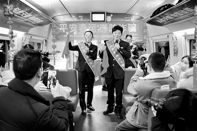 1月17日,全国春运工作启动。春运第一天,中国铁路上海局集团有限公司杭州客运段值乘的G7467次列车上,张灯结彩,年味浓浓,列车工作人员为旅客送上大红福字,表演文艺节目等,让旅客旅途充满欢声笑语。