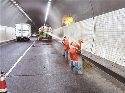 图为常山“公路人”清洗205国道常山段岭灯坞隧道。徐莹 刘乾旦