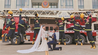 通讯员陈文青摄影报道 元宵节前夕,一组创意消防岗位婚纱照引起不少人关注,“红色的云梯车、橙色的消防服、蓝色的灭火服”等消防元素搭配洁白的婚纱,构成一幅绝美的浪漫画面。