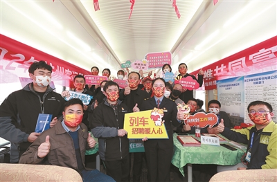 | 由省市县工会志愿者、全国劳模、列车员、企业招聘专员等组成的列车招聘团队。 记者邹伟锋 摄 |