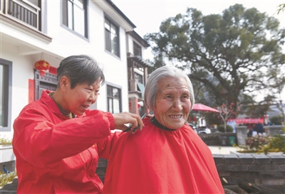 杭州市临安区昌化镇“有礼昌化”流动志愿服务站的志愿者们定期前往各个乡村,开展送知识、送服务、送宣讲、送文明、送健康“五送行动”,为群众提供多种志愿服务。自2020年成立以来,“有礼昌化”志愿服务站已完成千余次志愿服务活动,服务群众超1万人次。图为昨日,昌化镇“有礼昌化”流动志愿服务站的志愿者在给白牛村95岁的村民方田英(右)上门理发。 新华社记者徐昱 摄