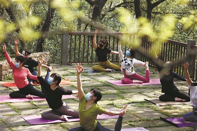 图为在德清县乾元镇大闸公园,瑜伽爱好者在做瑜伽。