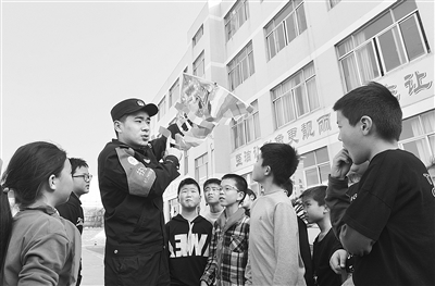 图为铁路民警向学生讲解在铁路沿线放风筝的危害,告诫学生不要在铁路周边放风筝。通讯员林利军 摄