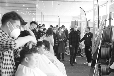 “没想到我这把年纪了还能有这待遇,让这么厉害的造型师给我理发,这个发型我很满意。”一位上了年纪的职工说道。本次活动共邀请4名顶级美发造型师参加,通过7个多小时持续作业,完成了150余名一线职工造型设计改造。图为职工们排队等着进行造型设计。