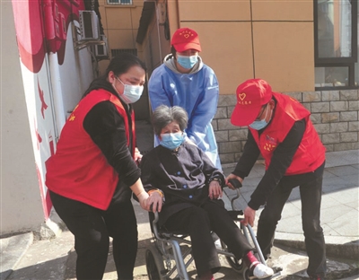 图为衢州市总工会党员志愿者孔琪(图中)和社区志愿者帮助行动不便的老人前往检测点做核酸检测。