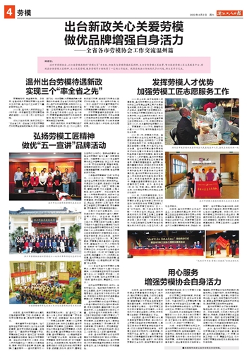 近年来,温州市劳模协会不断探索健全劳模管理服务新路子、新方法,强化劳模动态管理,及时动态掌握全市劳模新增、调出、调入、退休、去世、撤销荣誉以及家庭生活困难等方面的基本信息。去年完成了劳模工匠服务管理平台建设,一站式劳模工匠动态服务管理平台初见雏形;今年已完成升级建设全面投入使用,并积极筹划全新的“劳模幸福在线”平台。
