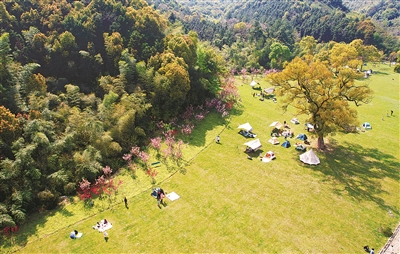 清明时节,万物皆显。小长假期间,人们按照疫情防控要求,纷纷就近在温暖和煦的春风中踏青、赏花,乐享春日美景。图为杭州市临安区大园路寺前公交站附近的大草坪上,人们搭帐篷、放风筝、开心玩耍。