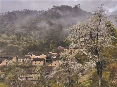 一路山道弯弯,一路涧水淙淙,一路的满目葱茏。行至村口廊桥,飘来深情悠扬的《梨花又开放》:“忘不了故乡年年梨花放,染白了山冈我的小村庄……”歌声空灵纯净,字字意境深邃,句句回味悠长。只可惜连日阴雨,原本恰值花期、满树堆雪的仙境,而今已是落尽梨花春又了,惟有翠色和烟云;玉雨落处香犹在,人生看得几清明。