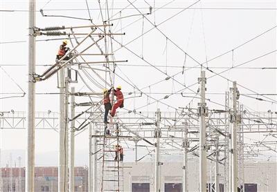昨日,台州市域铁路S1线温岭市城南路段,建设者在安装铁路接触网开关引线。