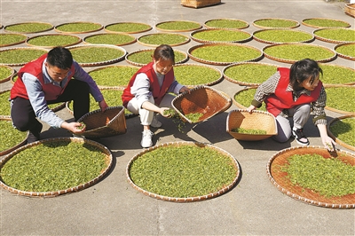 图为近日,桐庐县百江镇年轻干部在罗山村帮助农户进行茶叶晒青,实现助农增收。