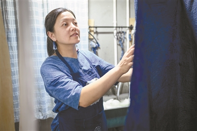 “我从前是个急性子,接触植物染后,知道‘欲速则不达’,凡事必遵从自然规律。”张剑峰学习蓝印花布和扎染,在一针一线、一刀一划一染色中沉下心,慢慢变得越来越温和、从容。