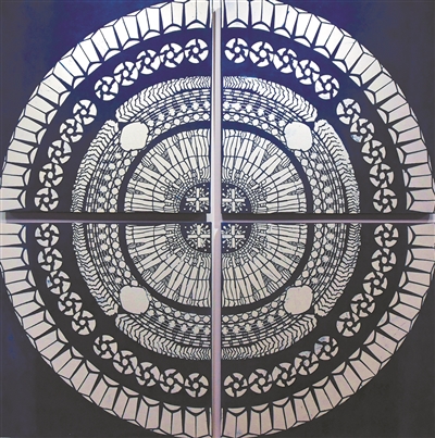 在展厅,作品《万众一心》格外引人注目。整个作品以组成圆形的四个版块组成,中间的间隔巧妙地形成了象征医疗救护的十字标志形状;最中心的“x”符号代表“病毒”也预示着它终将会被消灭;直面“病毒”的是一线医务人员,他们用身体铸成密不透风的防护墙;戴口罩是疫情防护的有效手段,口罩之下是各个领域不同身份的抗疫人士;外围图案寓意其他在本次疫情中贡献的爱心和力量。
